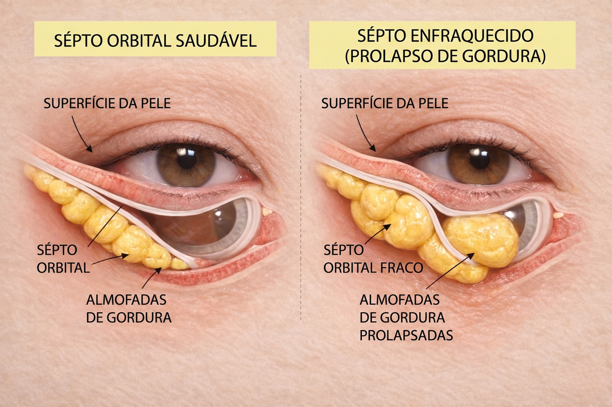 Por trás da pele abaixo dos olhos existe uma membrana fina chamada septo orbital. A função dela é manter pequenas bolsas de gordura no lugar.